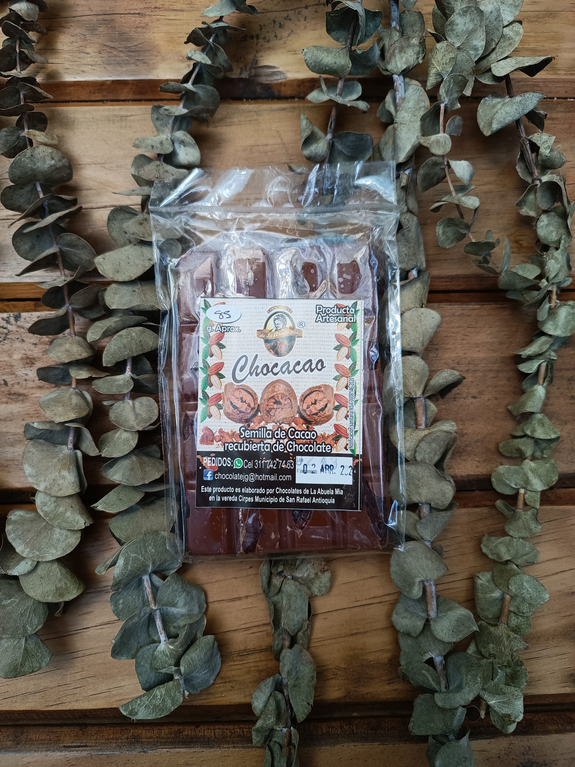 Chocolatina con trozos de semilla de cacao recubiertas de chocolate puro de las montañas de San Rafael . Gramaje aproximado